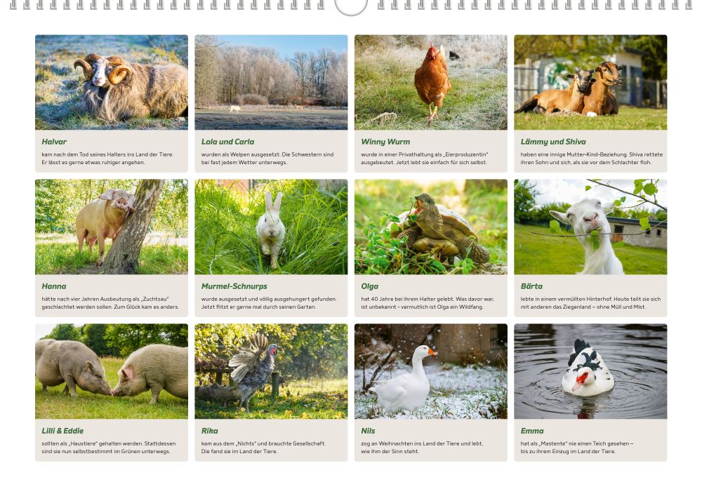 In dem Kalender werden jeden Monat gerettete Tiere, die ihr Zuhause im Land der Tiere gefunden haben, und ihre Geschichte vorgestellt. Mit dem Kauf eines Kalenders hilfst du die hier lebenden Tiere langfristig zu versorgen und weitere Unterkünfte für gerettete Tiere zu schaffen.