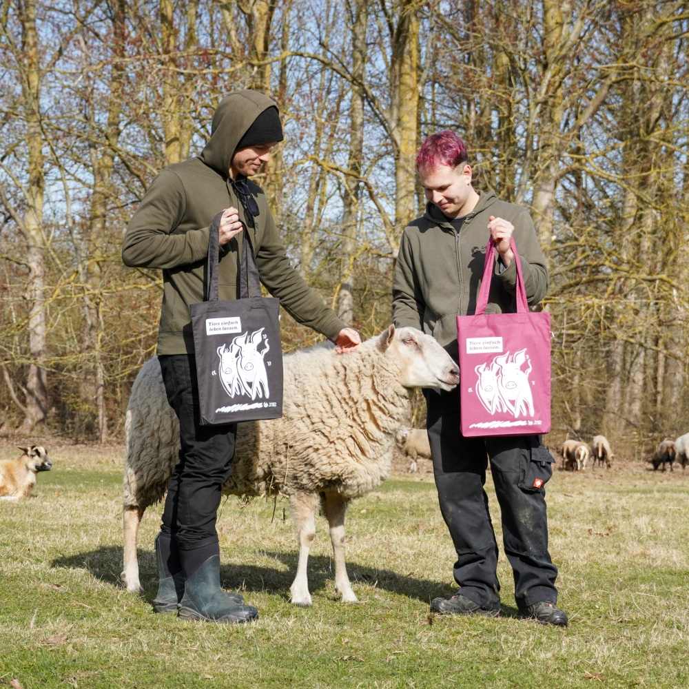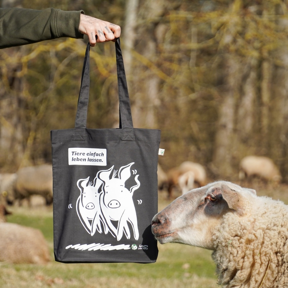 Die fast schon legendären Land der Tiere-Rennschweine gibt es auch auf Tragetaschen! Die Rennschweine sind Anni & Rosalie, die seit ihrer Rettung im Land der Tiere leben.